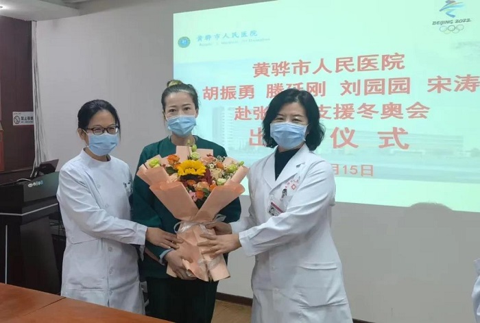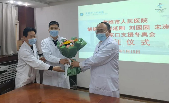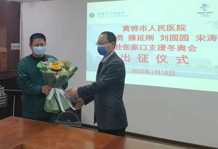 北京冬奥,世界盛会。即将开幕之前,我院派出骨科副主任医师胡振勇、主管检验医师滕延刚、护师刘园园,司机宋涛四名同志及配置设备齐全的专业救护车奔赴张家口赛区,助力医疗防疫保障工作。1月15日下午举行了出征欢送仪式,党委书记、院长刘西斌,党委副书记张志正,副院长刘云凤、康国强、辛海松,相关科室负责人参加。